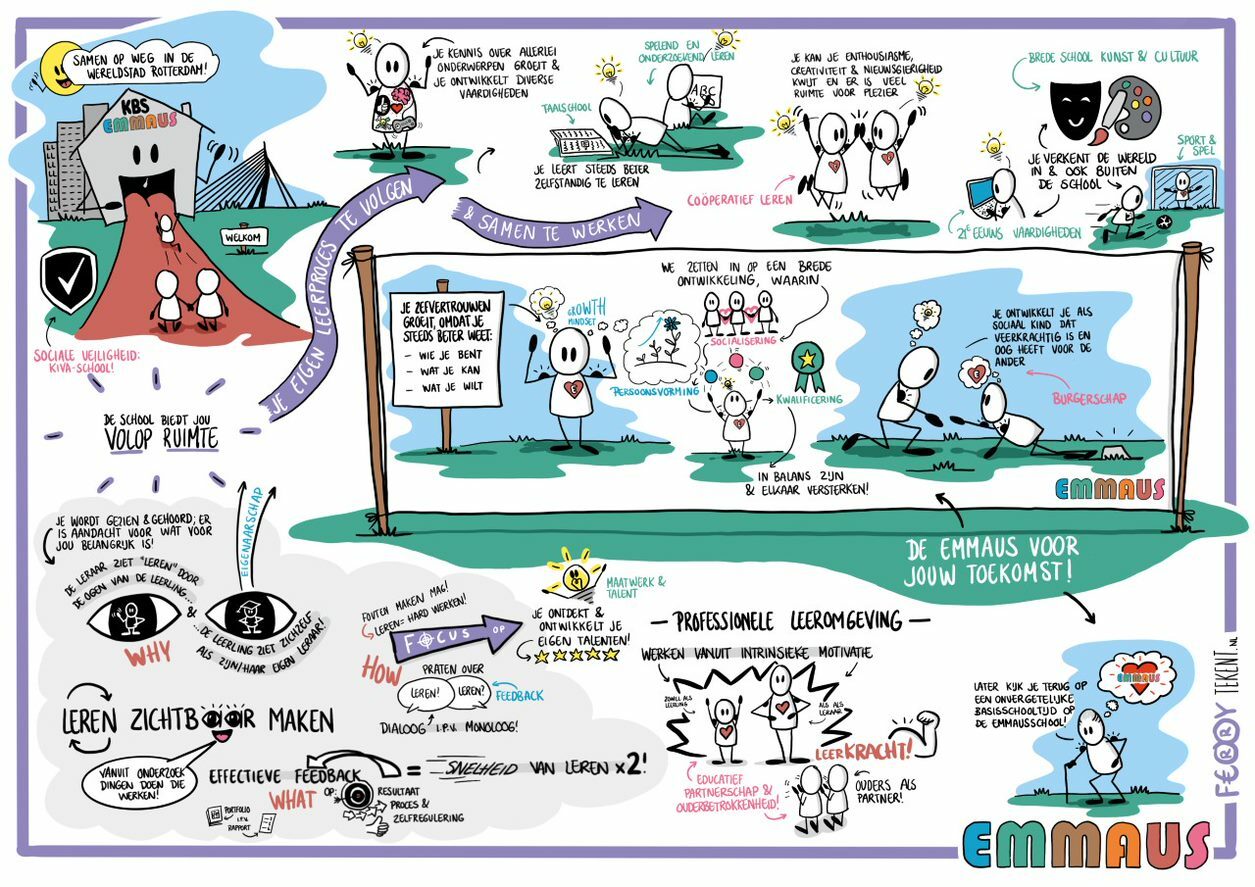 “Op de Emmausschool voel jij je altijd welkom. Je wordt gezien en gehoord en er is aandacht voor wat voor jou belangrijk is. Je leert steeds beter zelfstandig te leren. Je kennis over allerlei onderwerpen groeit en je ontwikkelt diverse vaardigheden. Je ontdekt en ontwikkelt je eigen talenten. In de loop van de jaren groeit je zelfvertrouwen, omdat je steeds beter weet wie je bent, wat je kan en wat je wilt. De school biedt jou volop ruimte om én je eigen leerproces te volgen én samen te werken. Je ontwikkelt je als een sociaal kind dat veerkrachtig is en oog heeft voor de ander. Je verkent de wereld in en ook buiten de school. Je kan je enthousiasme, creativiteit en nieuwsgierigheid kwijt en er is veel ruimte voor plezier. Zo zijn wij samen verantwoordelijk voor een school waar je graag naartoe gaat en de basis voor je toekomst legt. Later kijk je terug op een onvergetelijke basisschooltijd op de Emmausschool.”